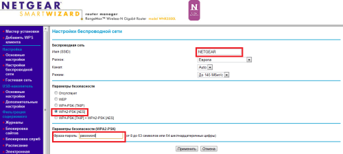 Выбираем слева «Настройка-> настройка беспроводной сети», заполняем поля «Имя» - это имя вашей Wi-Fi сети, «Режим» - любой, рекомендуется «до 145Мбит», «Параметры Безопасности» - «WPA2-PSK [AES]», «Параметры безопасности» - ваш пароль от сети Wi-Fi. Пример настройки на картинке.